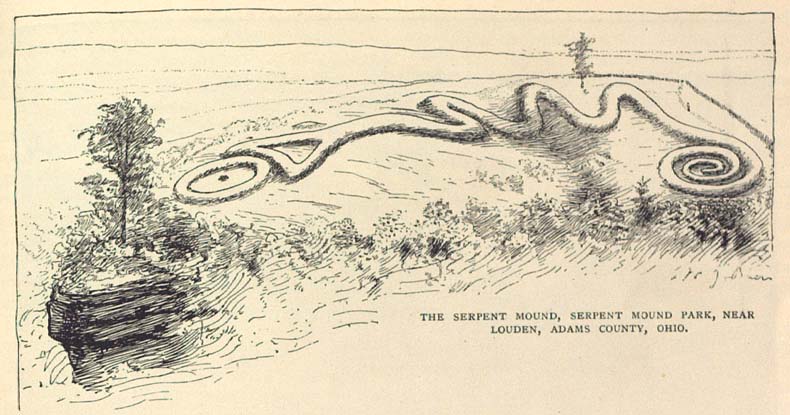 The Great Serpent is an ancient effigy mound around 5000 years old. Its mouth is open ready to swallow the cosmic egg and its body is 1300 feet of coils ending in the spiral tail almost like a labyrinth. The body is a few feet high of perfectly molded earth covered with a skin of grass. The curving body lays on gently rolling land giving a look of living velvet. Each of the seven coils points to a different place in the heavens. It is a living observatory of the equinoxes and solstices, moon phases and constellations.
