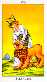 Our beautiful and gentle Strength, card number 8, has the lemniscate over her head as she tames the wild beast of our animal nature. When you turn the 8 on its side it becomes the infinite connection with her higher self that connects her to the spiritual strength she needs. Now she has the right force at the right time and the right place to balance her world. She is controlling the lion with gentleness and compassion. She is using her inner strength to demonstrate bravery, endurance and steadfastness, important skills for the trials ahead on the path of life.